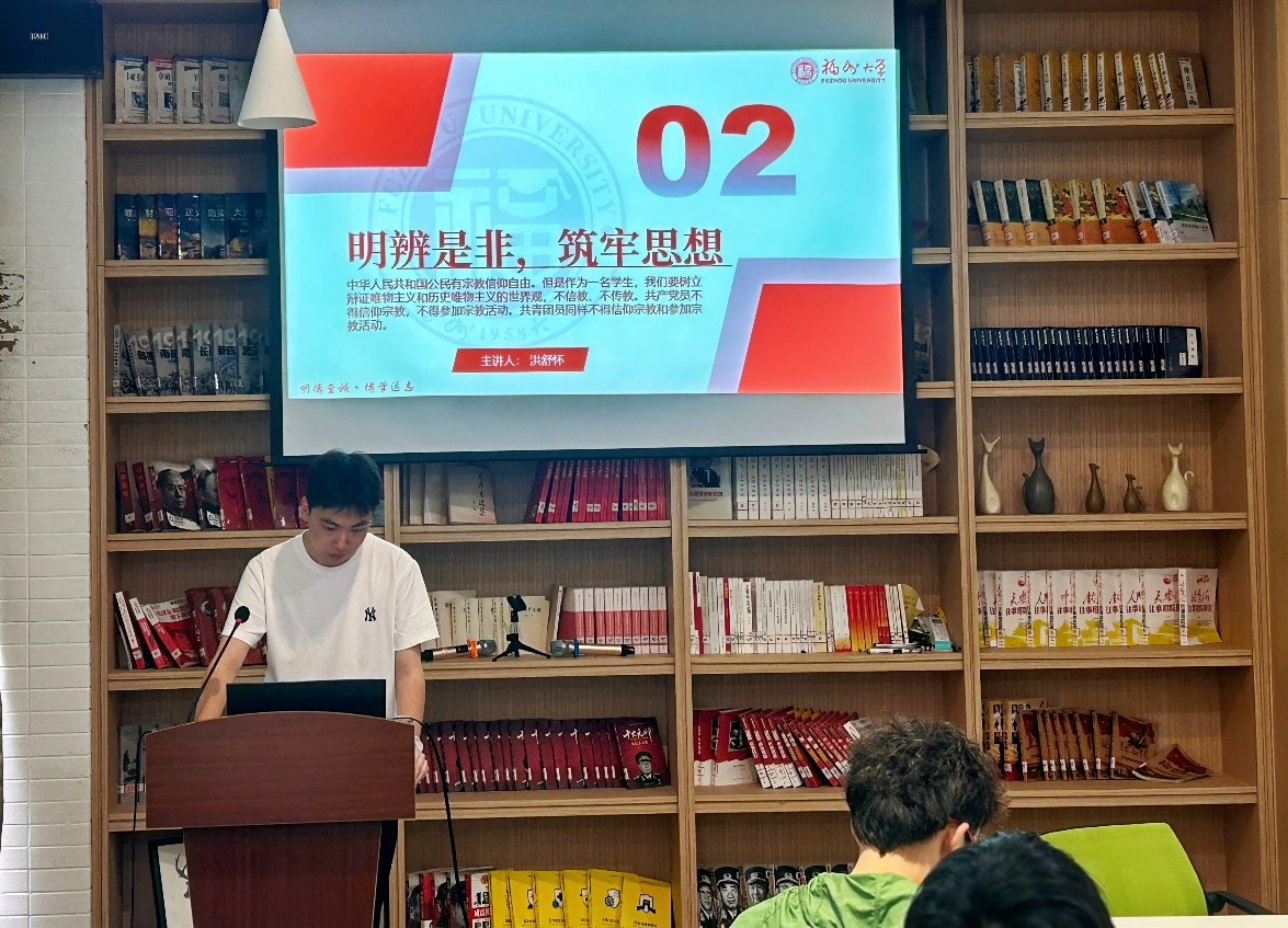明辨是非,筑牢思想:接着,团支书洪舒怀同学围绕宗教法规教育展开讲解。他系统介绍了大学生宗教政策法规要点,明确了教育与宗教相分离的基本原则。在风险防范部分,他提出三条具体建议:提高警惕、加强学习、积极举报,提醒同学们坚决抵制任何形式的非法传教活动,共同维护校园秩序。