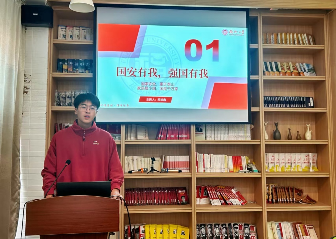 国安有我,强国有我班会伊始,班长苏祖鑫同学国家安全小课堂开场,与班级同学进行简单的问答互动,随后系统讲解了总体国家安全观的核心要义。他从国家安全的定义出发,解读了以人民安全为宗旨、以政治安全为根本、以经济安全为基础的五大要素,梳理了国家安全的五个统筹和20个重点领域,帮助同学们建立起总体国家安全观的系统认知。