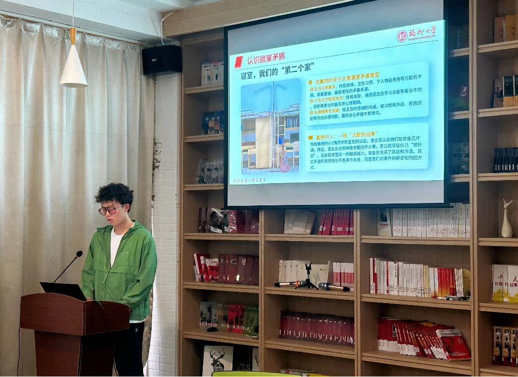 心向阳光,和谐共生:党支部书记陈廷轩同学围绕寝室矛盾问题开展心理健康教育。他通过调研收集了班级同学常见寝室矛盾类型,引入归因理论剖析矛盾背后的心理动机,指出寝室矛盾升级很大程度上源于归因偏差,从而形成负面归因负面情绪对抗行为沟通失败的恶性循环。他向大家介绍了我信息沟通法和寝室公约签约机制,为构建和谐融洽的寝室关系提供了切实可行的方法。