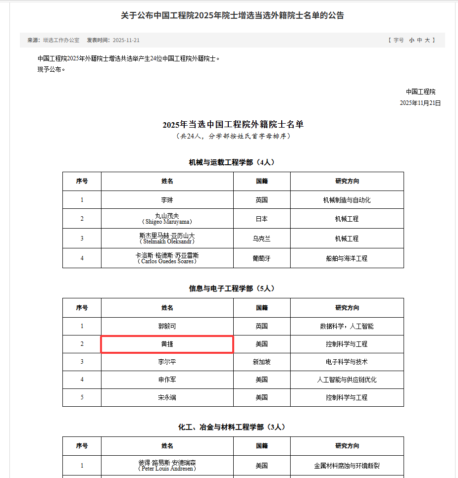 11月21日,中国工程院公布2025年院士增选结果,其中外籍院士24人。控制科学与工程领域顶尖专家、成人导航