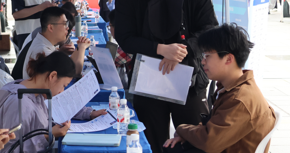 招聘会现场气氛热烈,求职学子围绕岗位职责、发展前景和能力要求,积极投递简历,与招聘人员面对面深入沟通,展现出良好的职业素养和求职状态。