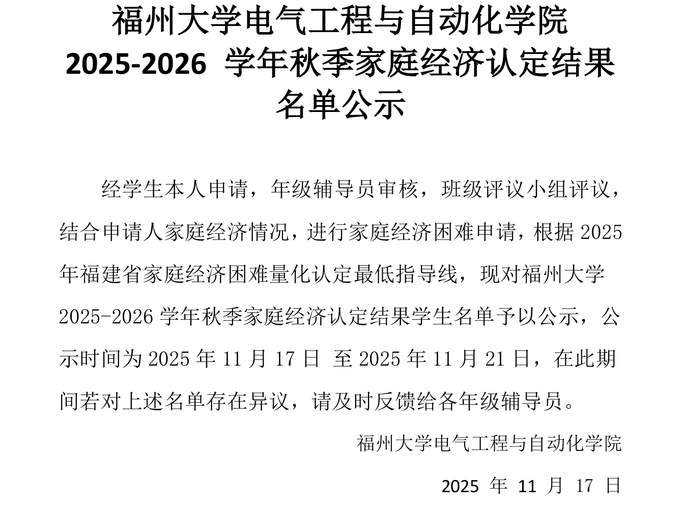电气学院关于2025-2026学年本科生家庭经济困难学生认定领导小组成员及年级评议小组成员的公示