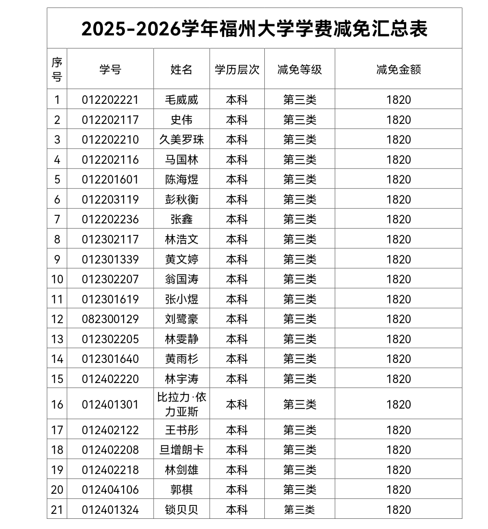 根据《成人导航 学费减免实施办法》(修订)(福大学[2017]109号)文件要求,经同学申请,学院资格审核,并经学院奖助学金评审委员会评审。现学院奖助学金评审委员会拟同意毛威威等42名同学学费减免的申请。现将拟同意申请人员名单公示如下,公示时间为2025年12月30日-2026年1月4日,在此期间若对上述名单存有异议,请及时予以反馈给各年级辅导员。